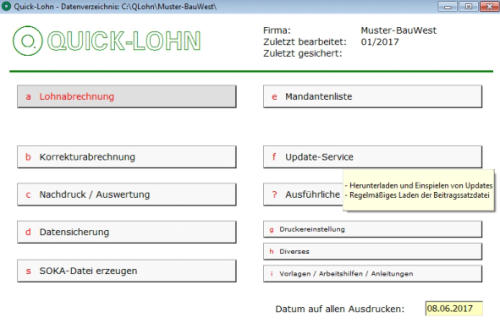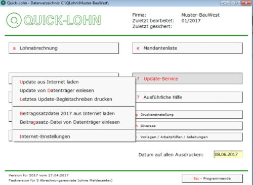 1. Bitte starte Sie Quicklohn und wählen Sie aus dem Auswahlmenu den Punkt "f - Update-Service" an.